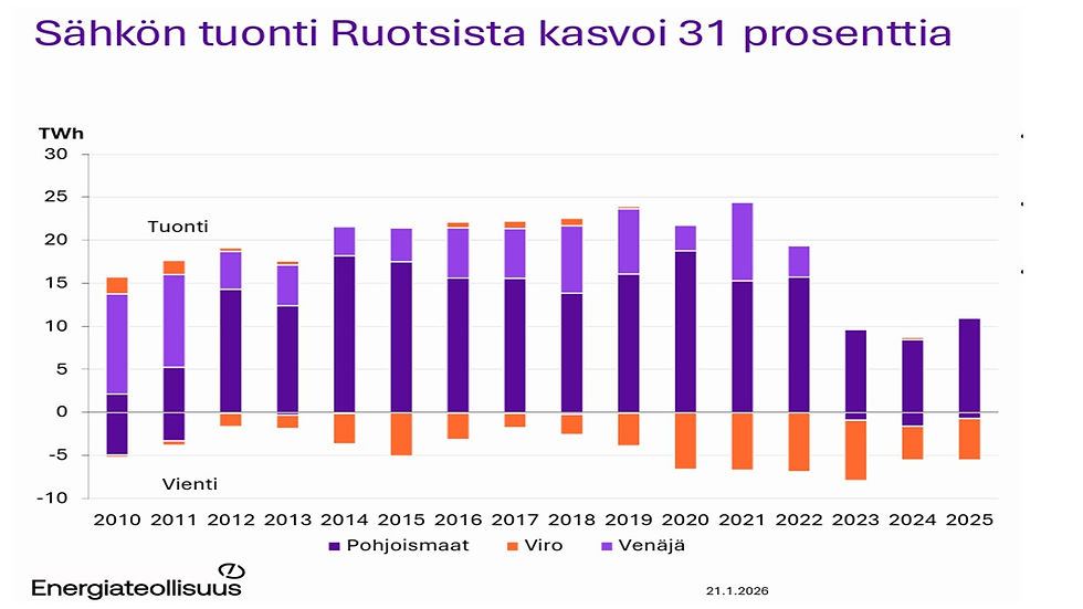 Hei, sähkön tuonti itse asiassa väheni ruotsin suunnalta, ja pitkästä aikaa ruotsiin vietiin sähköä 22 alkaen. Tuulivoiman lisäys näyttää korvanneen aiempaa ruotsin tuontia. Vienti taas tapahtuu silloin, kun hinnat ovat pohjalla (tuulee paljon). Mielenkiinnolla odotan jonkun laskevan tämän viennin / tuonnin arvon oikein hinnoin. Venäjän tuonti laski aikoinaan pörssihintaa, keskipäivällä ja yöllä (vientikielto aamu ja ip). Venäjällä ei ollut vientirajoitusta joulujuhlan aikaan tammikuun alussa, jolloin hinta pörssissä pysyi maltillisena koko päivän.